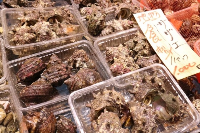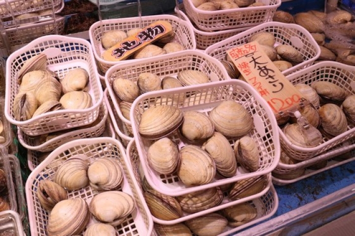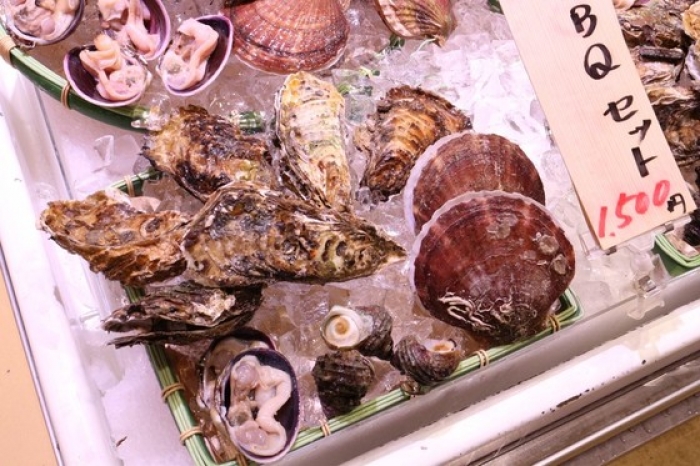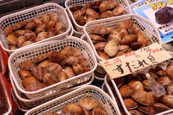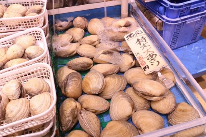 2017/06/25貴重な特大サイズの大あさり!数量限定です! 身が分厚くてBBQに最高ですね! 水槽で活かしたまま売っています! 大サイズは1カゴに6-7個入って1,200円! 一口で食べきれないほどの大きさ!贅沢ですね~! お値打ちなBBQセットもあります!写真のセットで大体、4人前位です。 よくお客様から聞かれるのが「カキ、ホタテはどうやって開けるの?」という質問ですが、焼ければ勝手にパカッと開くので心配いりません。 2人なら、この位のセット+お好みで追加がお勧めです。 地物、南知多産のさざえも大きなサイズでおすすめ! 本日は貴重なすだれ貝もあります!BBQはもちろん、酒蒸しも旨い貝です。