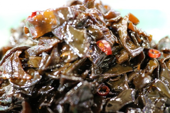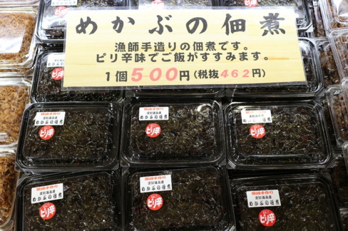2016/03/04激ウマ!めかぶの佃煮♪ 漁師さんの手作りなので数量限定!しかも安い! 入口入ってすぐの「佃煮コーナー」で販売中です♪ 見てください!このツヤ! 甘辛い濃い目の味付けが最高です(^-^) 炊き立てご飯に乗せて… おにぎりの具に入れても最高です。 みなさん我慢できますか? 私は我慢できませんでした(笑) 濃い目の味付けとコリコリ食感がたまりません!! そろそろ水温も上がり始めてきました。 旬の海藻類も育ちすぎると固くなってくるので、そろそろ終わりの気配です。 生めかぶが終了すると佃煮も終了です。是非、この旨さをお試し下さい!