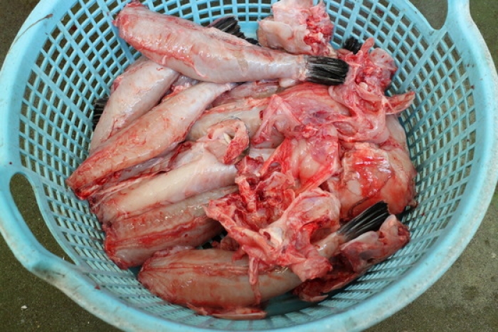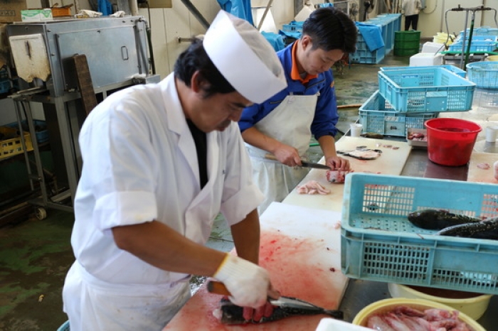 2015/10/07昨日に引き続き、今日もトラフグをセリ落としてきました♪ いけすから出して即解体します!鮮度抜群♪ トラフグの解体はベテラン職人でも1匹当たり10分位でしょうか? 小さな血合いも全て取り除く細かい作業。大変な作業ですね(-.-) 更に血を完全に取り除くために、しっかりと洗います! ここまでやると1匹当たり20分!こりゃぁ大変だぁ~! もうちょっとすると、魚太郎の売り場にもトラフグが並びます♪ 準備中ですので、もうしばらくお待ちくださいね。