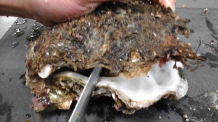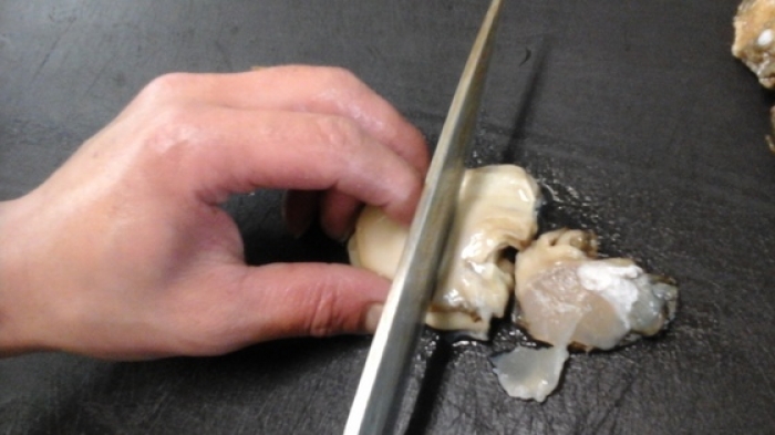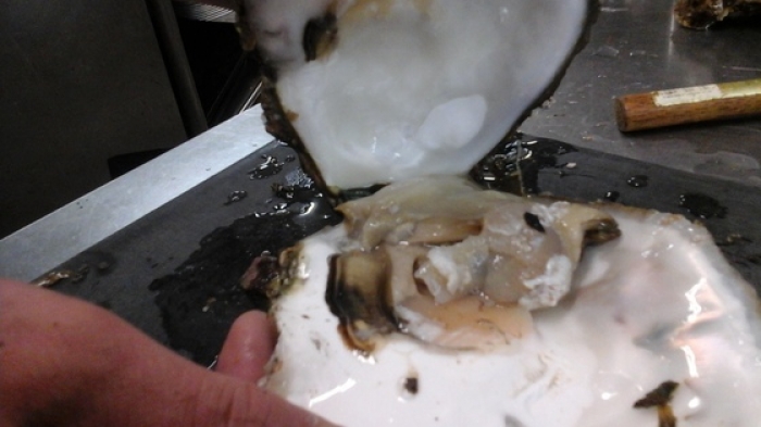 2015/05/16岩ガキ この岩ガキサイズ的にはお子さんの手の平ぐらいかな”””””” 貝開け開始 身も貝柱もしっかりとしてま~~~す この身の張り、美味そーーーーー 3等分に切ってみました 「もう半分に切って6等分にしても良かったかも!」 今回は紅葉おろしとねぎ、ポン酢頂きました 他のおすすめ召し上がり方として オリーブオイルと挽きたての黒コショウ、レモン果汁は御存じと思いますが 変わり種として ゆず胡椒少々乗せコーヒーフレッシュをチョッピリ掛けて