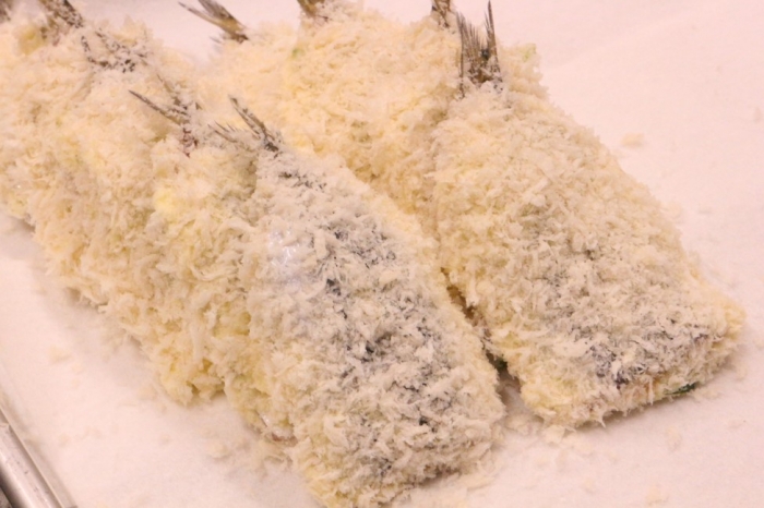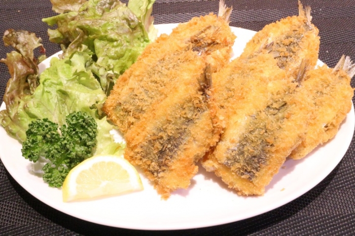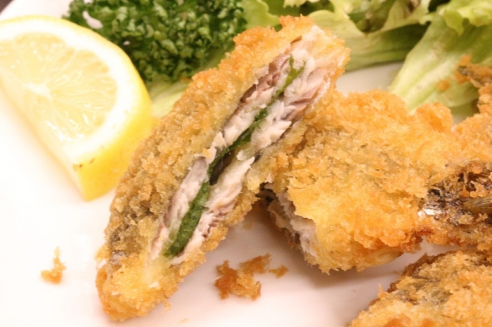 2017/10/15南知多産!獲れたていわしが入荷しました! 南知多産/獲れたていわし 1盛り200円!もちろん刺身用! 毎回、入荷時には飛ぶように売れていきます! 本日は頭と内臓を出して… フライにします! イワシに大葉と梅肉、チーズを挟んで揚げてみます。 この状態で冷凍すれば揚げるだけで便利ですね。 いわし12匹でこのボリュームです!安くて美味しいですよ。 大葉の風味が食欲をそそります… ぴかぴか鮮度なのでお寿司でも旨いですよ! 透き通るような綺麗な身ですね。