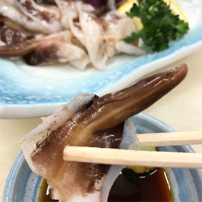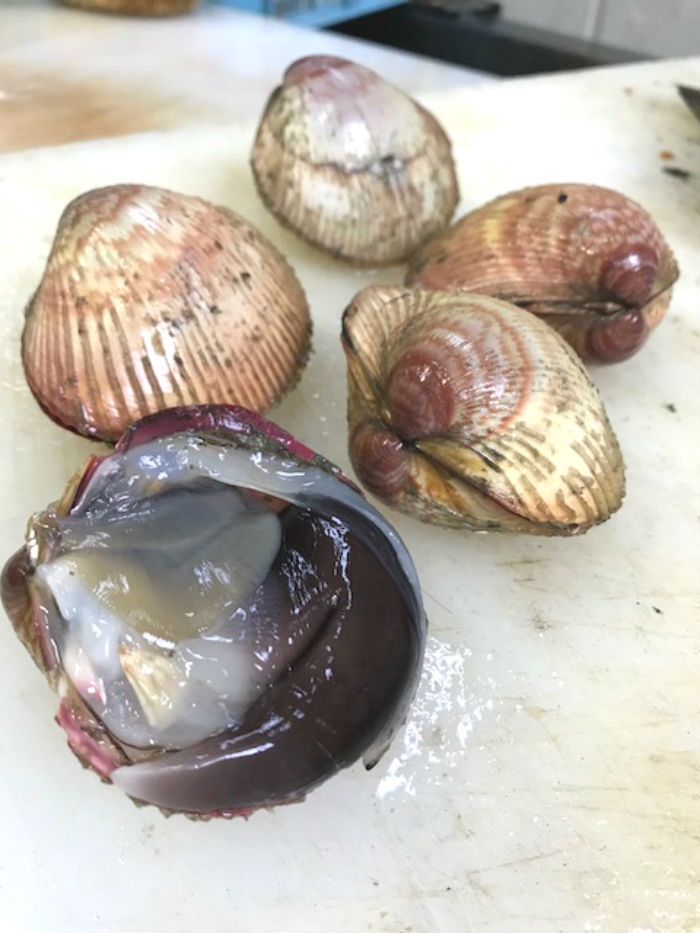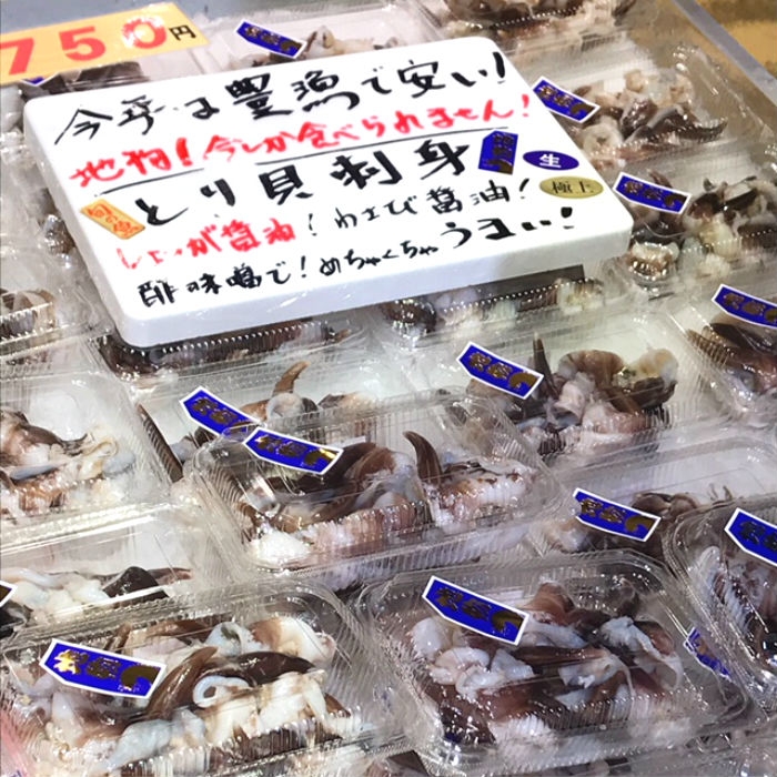 2018/04/26南知多産で大豊漁!とり貝が旨い! 殻を取るとこの状態です。 内臓を綺麗に取り除いて、貝の外側に黒い水管部分を食べます! 水管を包丁で開くと見た事がある形になります! 販売している物は茹でた物ですが、そのまま生で食べても抜群に旨いです! 今年のとり貝は特に肉厚!甘味があって抜群に旨みですよ。 1パック750円で販売中です! 毎日、一生懸命開いていますが少ししか捌けないので、数量限定で販売中です!