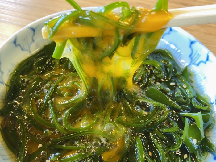2021/02/19ネバネバパワー南知多産生メカブ 海藻類が生で購入できるのは、限られた時期だけです。 普段は乾燥を使っている方も、ぜひ海藻の旬には【生】をお試しください! めかぶの芯の部分は少し硬いので、今回は使わず、クルクルの部分を細かく刻み 沸騰したお湯に入れて、一瞬で鮮やかなグリーンになりました(^^)/ 水にさらして粗熱を取ったら、器にオンっ! 卵の黄身をポンっ! 生姜醤油やポン酢、めんつゆ、なんでもOKですが 今回はごま油+塩少々+醤油で味付けしました! かき混ぜて、一気に召し上がれ(^^) やっぱり生は食感も風味も、違います! 旨い~◎ ご飯に刺身と一緒にぶっかけて、即席!漁師飯としても 楽しめます~(^^)/