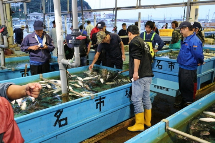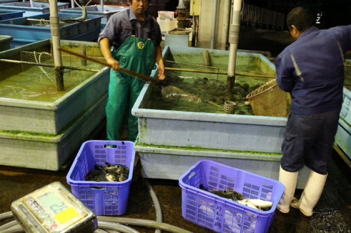 2015/10/16【今日の魚太郎】 トラフグの初セリ 本店水槽でプクプク… 出待ちです(笑) 真剣に品定め中です!初セリなので、いつもより気合い入ってます♪ どんどんセリ落とされていきますねー! 水槽付きトラックで本店水槽へレッツゴー。