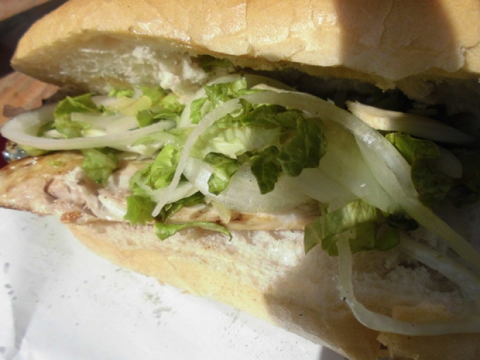 サバサンド~~ 焼いたサバをバケットに挟み、野菜も挟んで