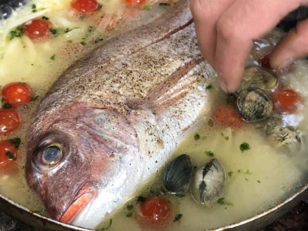 材料:ち鯛1尾/あさり/200g ミニトマト/100g オリーブオイル70cc にんにく2かけみじん切り玉ねぎ1/4スライス チキンコンソメでスープ薄め1L パセリ適量
