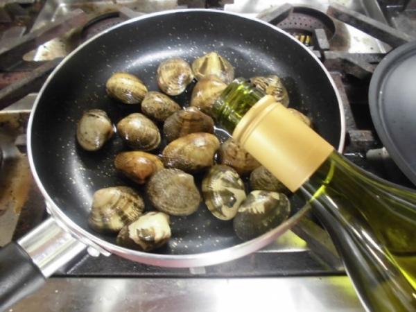 フライパンにアサリ入れ、白ワイン(日本酒でもOKですよ)注ぎ蓋をしてアサリの口が開くまで待ちます。