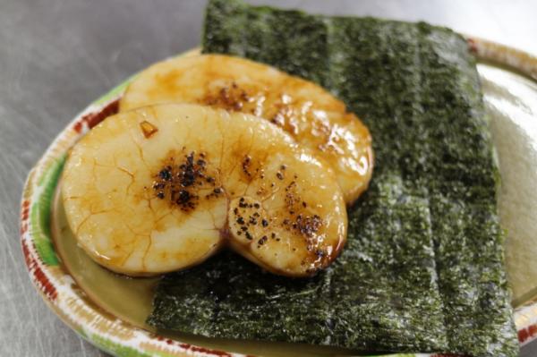 刺身用のタイラギの貝柱を少し厚めに切って、焼き、焦がし醤油で磯辺焼きに◎